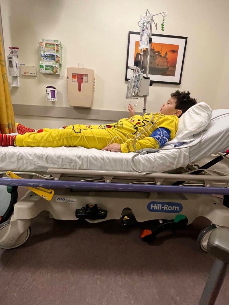 Once Tenzin and I arrive to the ER, he is placed into a room and they immediately start him on fluids and order the broad spectrum antibiotics (Cefepime) and draw labs. They are looking to see what his ANC looks like along with his hemoglobin and platelets. We have been through this a few times now so we know the drill and it is oddly comforting being in the hospital. It feels as though he is right where he belongs in that moment because I know those meds will help. Tenzin is so used to this routine now he just gets into the bed, asks for a blanket and starts to watch something on his phone. Child life always pops in to see if he or I need anything. Their familiar faces are also comforting in those moments. Tenzin's fever does spike (38.6 C which is 101.4 F) and they give him Tylenol as well. It is at that moment that I brace myself for the words YOU WILL BE ADMITTED. Shortly after the doctor comes to examine him and the bloodwork returns we do hear those words. His ANC did go down so it was necessary as he was very neutropenic.
